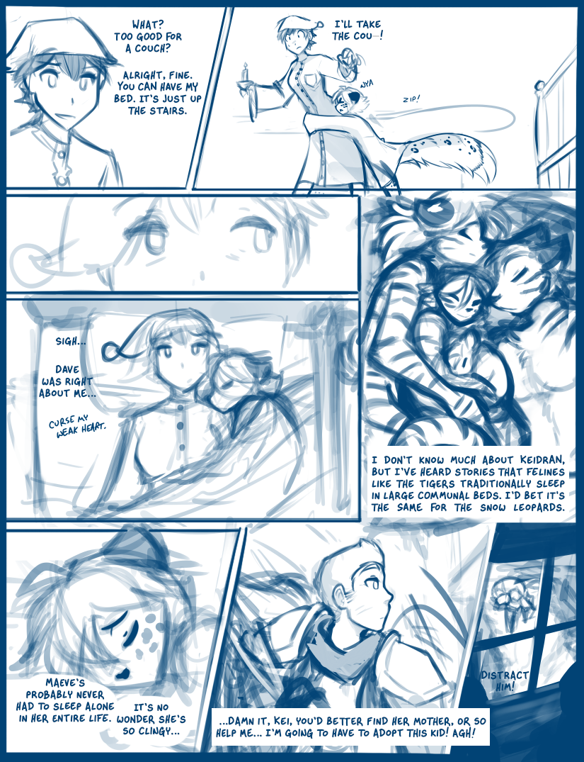 Элис Рид: (в мыслях) Я мало знаю о кейдранах, но слышала, что у кошачьих, вроде тигров, принято спать на больших общих кроватях. Готова поспорить, что у барсов так же. Это заставляет меня задуматься, где отец Мэйв… но лучше её об этом не спрашивать.